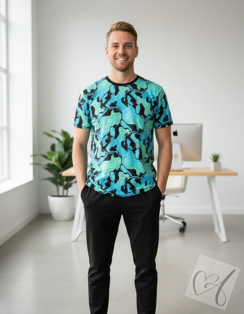 Styl a pohodlí v jednom – to je pánské tričko s výrazným geometrickým potiskem! Vhodné pro muže, kteří chtějí vypadat dobře a cítit se skvěle. Tričko má klasický střih, který sedí většině postav.