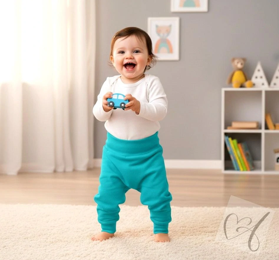 Rostoucí dětské kalhoty, baggy a harémky jsou navrženy tak, aby vydržely dětem co nejdéle. Díky možnosti zahnutí spodního nápletu kalhoty rostou s dítětem a přizpůsobí se jeho potřebám. Volnější střih zajišťuje pohodlí dětem s jednorázovou i látkovou plenou.